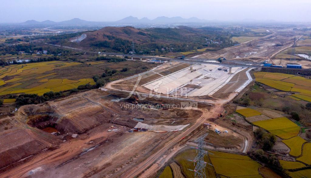 2019年10月31日,安徽省合肥市庐江县柯坦镇境内的引江济淮工程庐江试验段主体基本完工,一列火车正在通过铁路桥,河道雄姿初现。