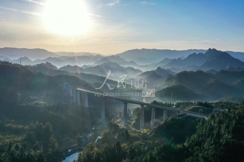 2019年10月31日,湖南省湘西土家族苗族自治州龙山县红岩溪镇,建好的黔张常(重庆市黔江区——湖南省张家界市——湖南省常德市)铁路西湖冲特大桥,在朝阳的映照下美丽而壮观。