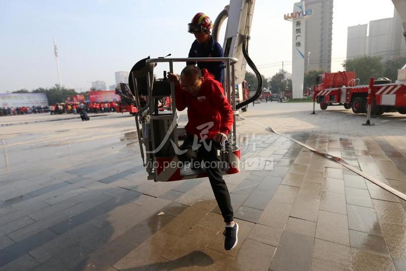 2019年11月1日,安徽省淮北市,消防救援人员利用平台登高消防车“救助”楼层被困人员。