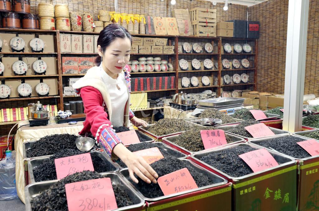 2019年11月1日,第13届苏州国际茶叶博览会上来自福建的茶商正在展示自己的茶叶。