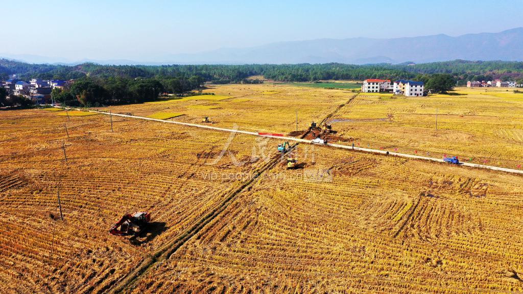 2019年11月1日,秋收过后,江西省吉安市吉水县文峰镇炉村机器轰鸣,工程施工人员抢抓晴好天气进行高标准农田建设施工。
