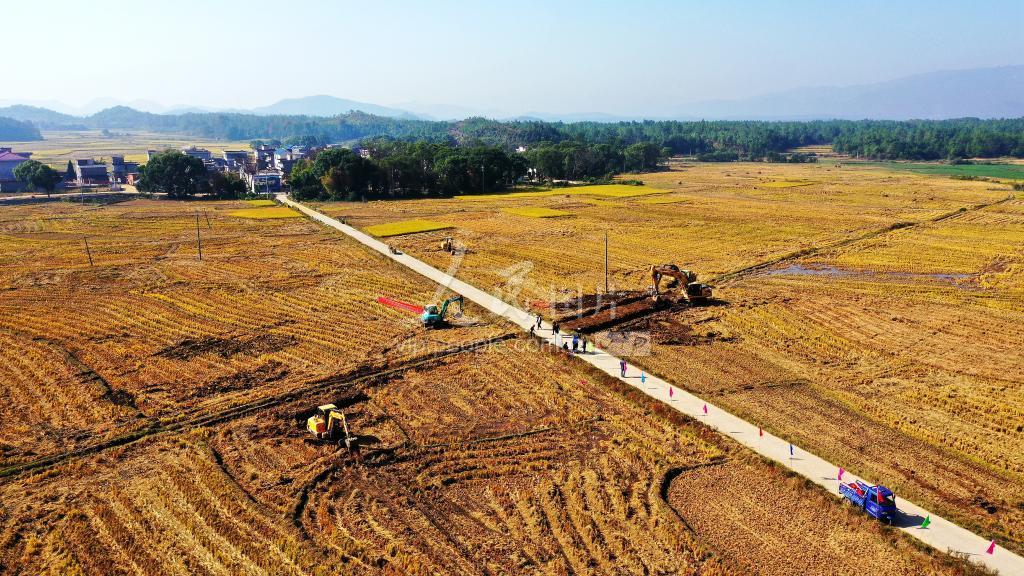 2019年11月1日,秋收过后,江西省吉安市吉水县文峰镇炉村机器轰鸣,工程施工人员抢抓晴好天气进行高标准农田建设施工。