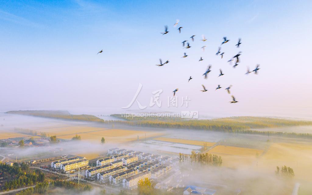 2019年11月1日,江苏省宿迁市泗洪县古汴河再现平流雾景观。如纱似曼的雾霭在汴河上空和两岸的树木、楼房间飘移,石集、城头两乡的自然村庄在雾中时隐时现,恍若仙境。