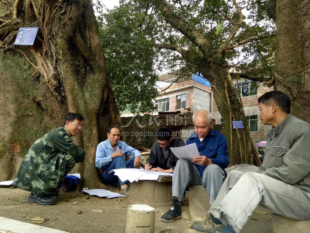 2019年11月1日,在广西罗城仫佬族自治县乔善乡板团村板泽屯屯前大榕树兜底下,村干、老党员及群众代表在召开屯级评议会,商讨评议该屯2019年度贫困户脱贫摘帽“双认定”工作。