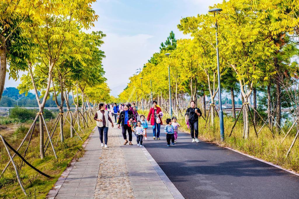 2019年11月1日,浙江省台州市仙居县横溪镇生态景观绿道杏林金黄,吸引了众多游人健身走,欣赏深秋绿道美景。 横溪镇绿道沿永安溪两岸而建,从五都潘村连接到埠头镇十都英二村,全长10多公里。绿道一边铺设鹅卵石,供游客健身行走;另一边沥青自行车道,供骑行游玩。绿化两边种植银杏树,呈现出一派春绿秋黄的生态景象。