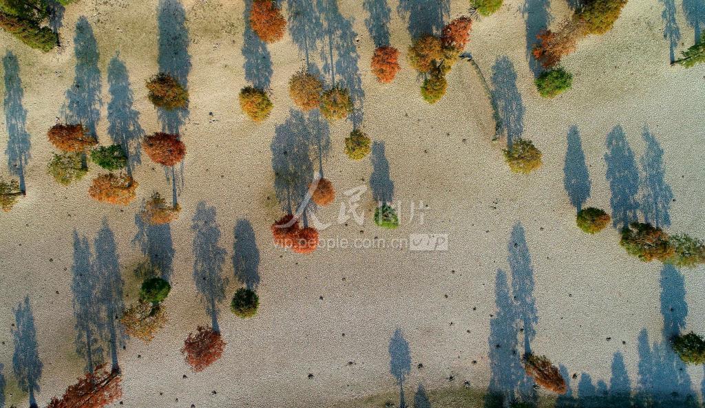 受天气影响,近日安徽省合肥市庐江县柯坦镇城池村大汉塘进入枯水期,生长在池塘里数千株池杉树“显露真容”。在深秋霜露浸染下,“水中森林”树叶由绿变黄变红,景色绚丽秀美。