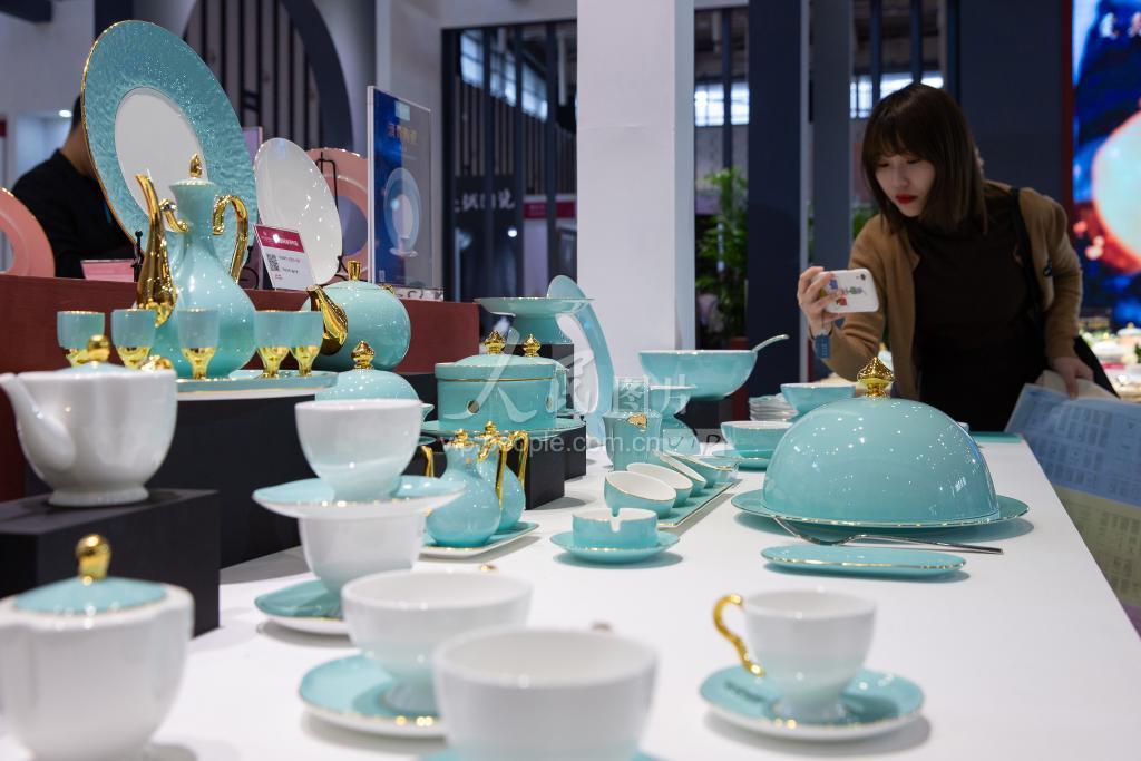 2019年11月7日,参观者在首届中国工艺美术博览会上参观展出的陶瓷餐具。