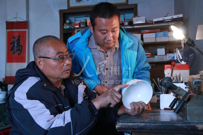 11月8日,陕西省富平县非物质文化遗产项目锔瓷传承人田更武正在向儿子田斌斌传授锔瓷技艺。