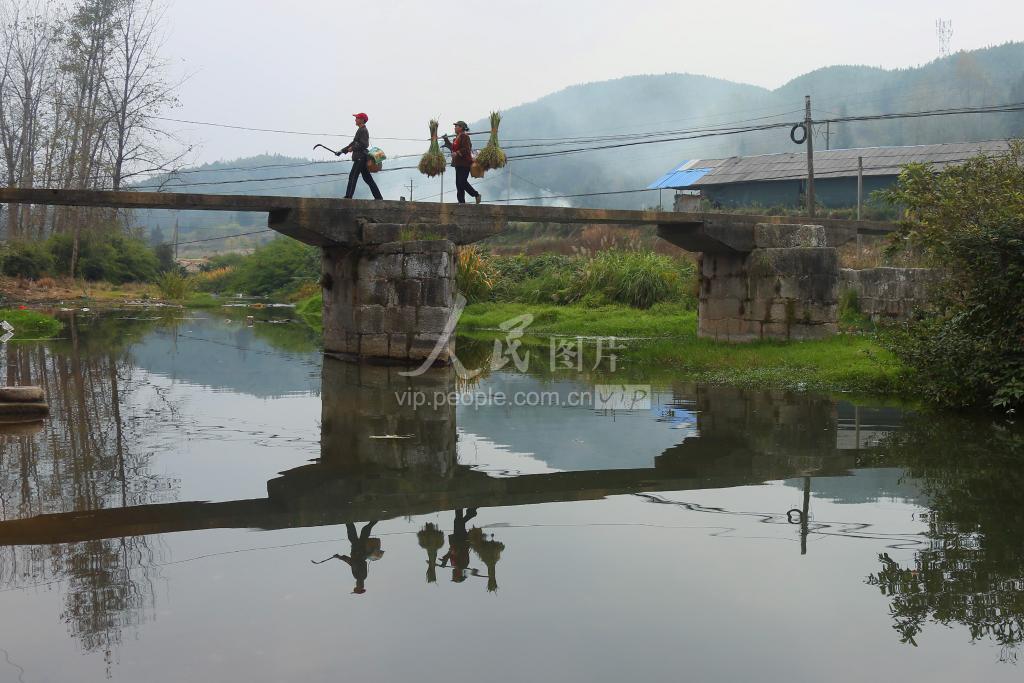 2019年11月17日,湖南省怀化市靖州苗族侗族自治县藕团乡三桥村,村民挑着收割的高粱从古石桥上经过。