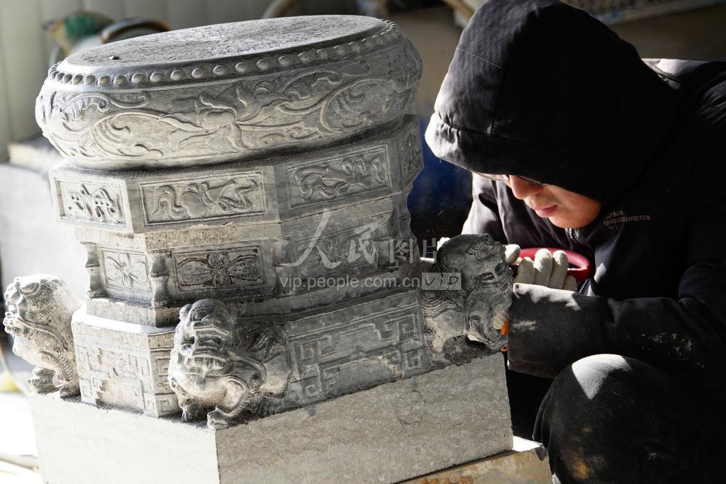 2019年11月18日,山西运城市新绛县北张镇西庄村八旬石雕大师家泽荣在给省级非遗新绛石雕传承人六旬儿子家玉顺传授祖传石雕技艺。 近年来,在当地政府和宣传、文化旅游、农金等相关部门合力扶持下,这座有着近千年传统石雕技艺的古老石头村靠山依石,石雕产业迅猛发展。 2017年新绛石雕制作技艺入选省级非物质文化遗产名录,而今,“西庄家,石头汉”的石雕工艺品不仅成为全国、全省文博文化旅游展会的常客,且多次摘金夺银,成西庄村新“石”期致富名片。
