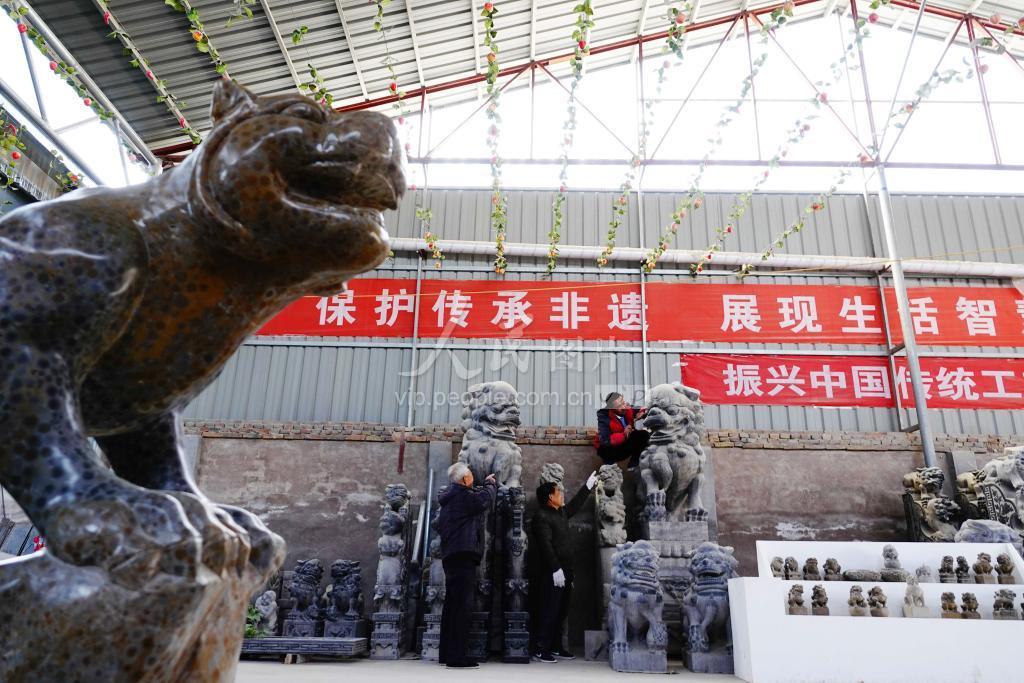 2019年11月18日,山西运城市新绛县北张镇西庄村八旬石雕大师家泽荣在给省级非遗新绛石雕传承人六旬儿子家玉顺传授祖传石雕技艺。 近年来,在当地政府和宣传、文化旅游、农金等相关部门合力扶持下,这座有着近千年传统石雕技艺的古老石头村靠山依石,石雕产业迅猛发展。 2017年新绛石雕制作技艺入选省级非物质文化遗产名录,而今,“西庄家,石头汉”的石雕工艺品不仅成为全国、全省文博文化旅游展会的常客,且多次摘金夺银,成西庄村新“石”期致富名片。