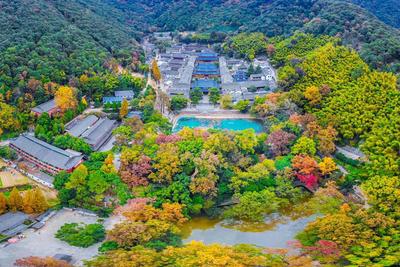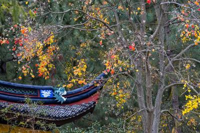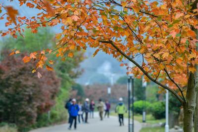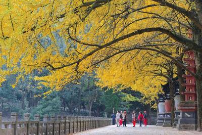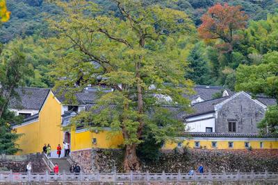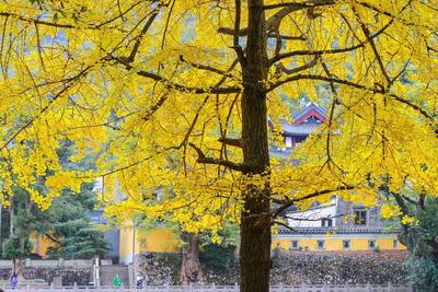 2019年11月21日,浙江省宁波市天童寺景区的银杏在阳光的照射下美得醉人,加之周边的红叶与绿色的翠竹相映,如同画卷。
