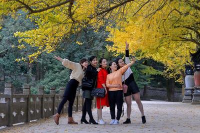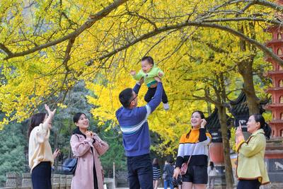 上传时间: 2019-11-21 19:57:22 图片说明: 2019年11月21日,一位孩子在宁波天童景区银杏树下游玩之时。