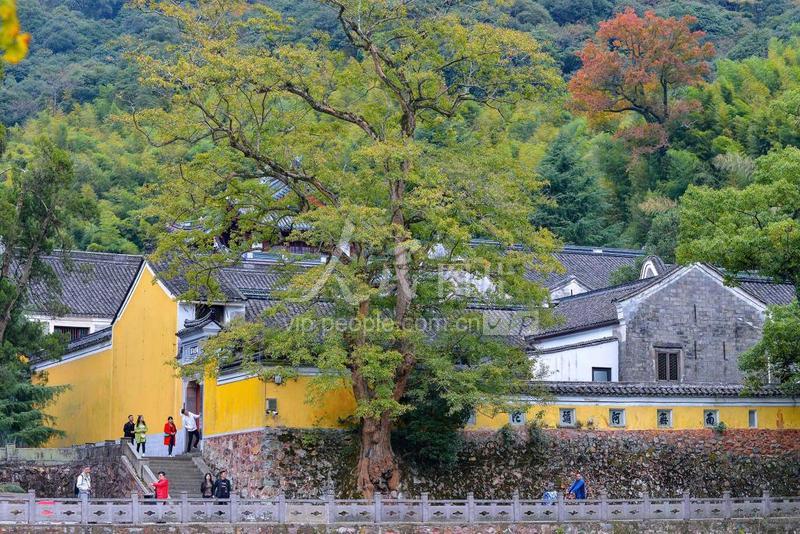2019年11月21日,浙江省宁波市天童寺景区的银杏在阳光的照射下美得醉人,加之周边的红叶与绿色的翠竹相映,如同画卷。