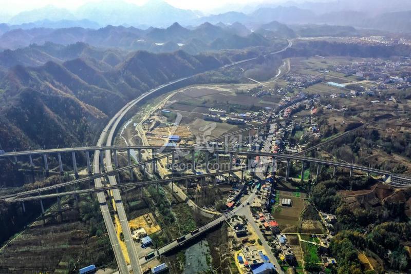 2019年11月21日,无人机拍摄宁西铁路、浩吉铁路、呼北高速与213国道、209国道,在河南省南阳市西峡县西坪镇镇区穿插而过。 位于豫、鄂、陕三省五县(河南省三门峡市卢氏县、淅川县、西峡县,湖北省郧县,陕西省商洛市商南县)结合部的河南省南阳市西峡县西坪镇是中原通向西北的“桥头堡”,素有“豫西南门户”之称。新中国成立70年来,特别是改革开放以来,随着国家交通事业的发展,这个偏远的豫西山区小镇逐渐发展成为豫、鄂、陕交界地区的交通枢纽。