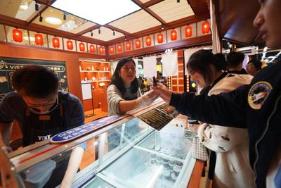 2019年11月24日,天津,营业中的茅台冰淇淋限时限量销售现场。昨天,茅台冰淇淋全国首店亮相天津。这家跨界冰淇淋店不仅有茅台冰淇淋,更有凤香型、清香型、浓香型、赤霞珠、甜白葡萄酒等6款酒香冰淇淋,给市民带来一场别具一格的味觉盛宴。据了解,茅台冰淇淋采用贵州茅台酒与普通冰淇淋混合而成,其酒精浓度3%(体积比),入口后还能感受到一丝丝酒的辣意。
