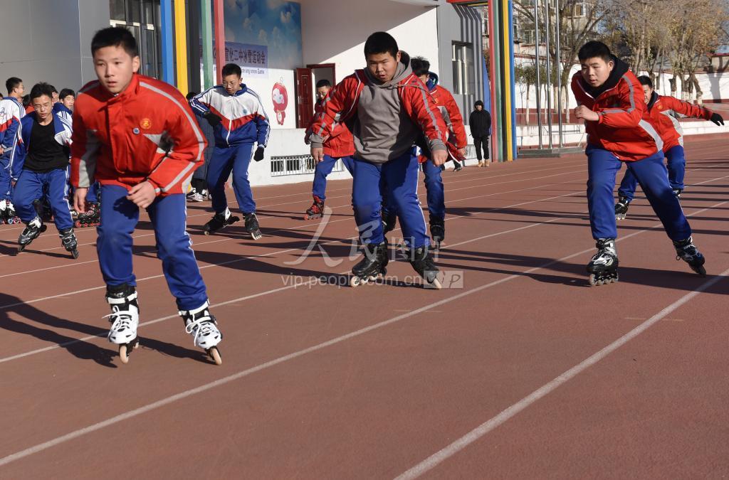 2019年11月28日,河北省张家口市宣化二中学生在冰雪运动会上进行轮滑比赛。