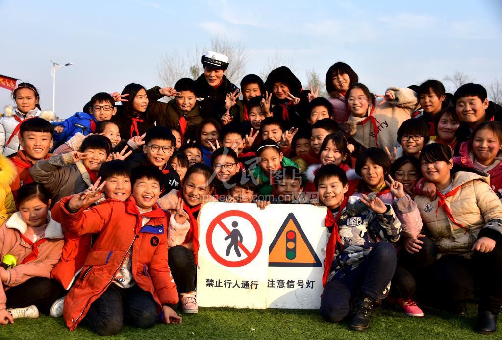 2019年12月5日,安徽省阜阳市阜南县新村镇露荷学校的学生们和交通安全标识快乐合影留念。