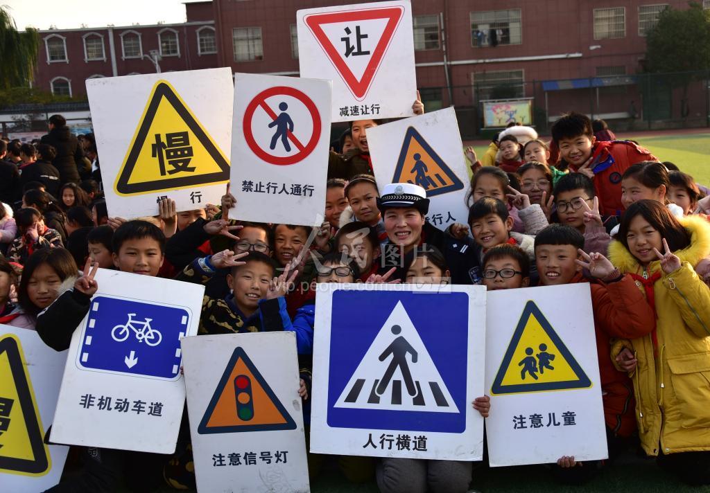 2019年12月5日,安徽省阜阳市阜南县新村镇露荷学校的学生们和交通安全标识快乐合影留念。为加强留守儿童交通安全意识,阜南县公安局交警大队走进该留守学校,向孩子们宣讲道路交通安全知识,培养孩子们从小遵守交通法规好习惯。