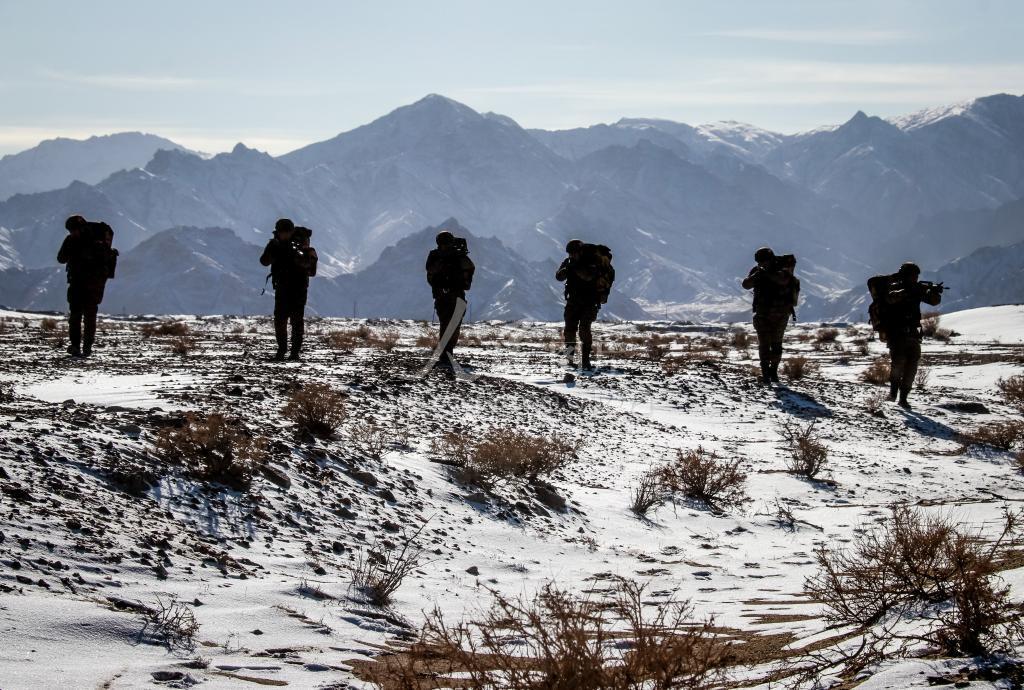 2019年12月18日,特战队员正在雪地中训练战术搜索。