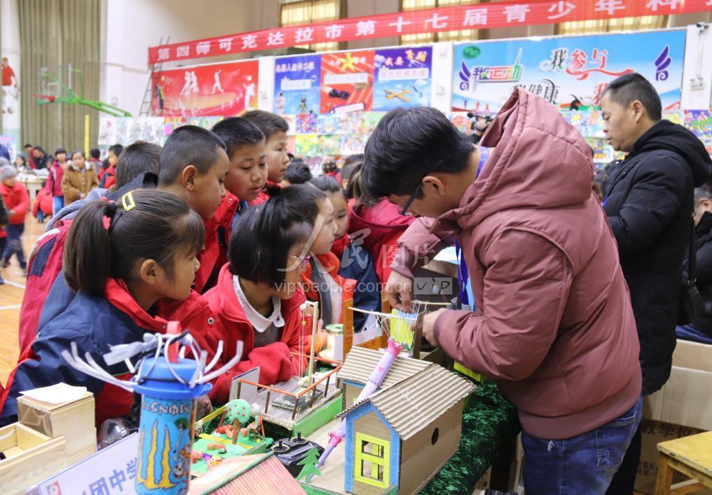 12月19日,参赛科技辅导员向与会学生介绍科技小发明作品。