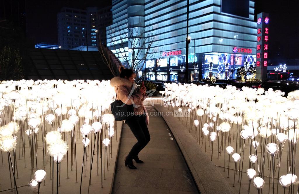 2019年12月26日晚,上海,新年将至,徐家汇街头2万盏蒲公英灯在周围夜景的衬托下,如梦如幻,吸引不少路人拍照留影。