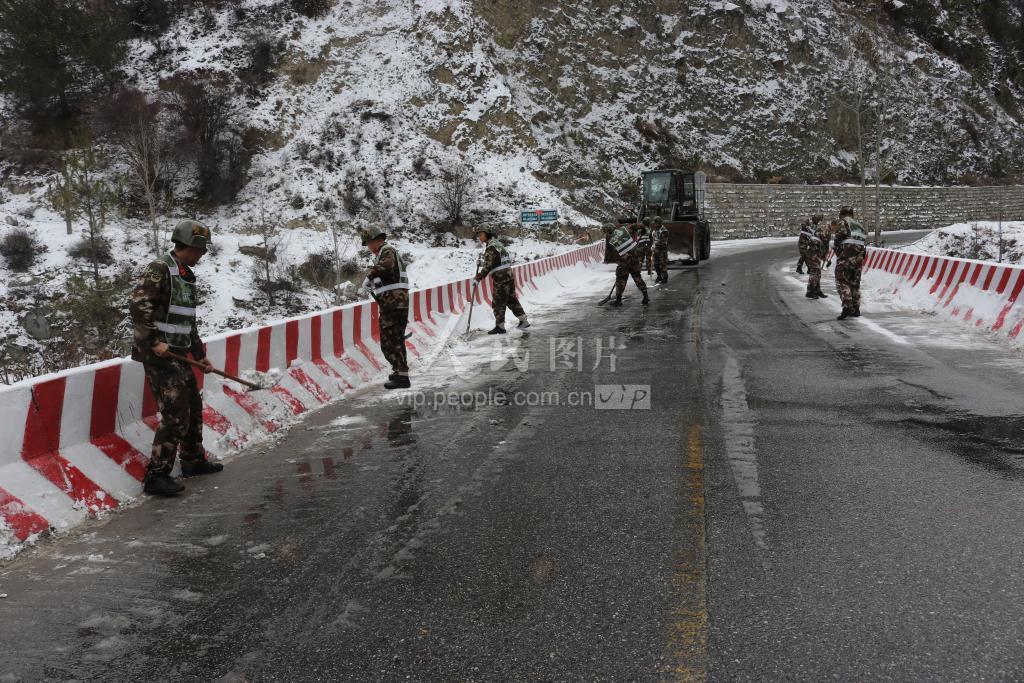 1月5日,武警官兵在川藏线牛踏沟段段清理结冰。