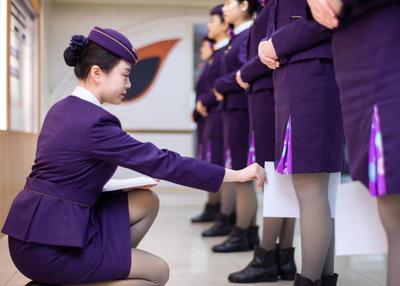 2020年1月7日,在南京客运段高铁一车队,乘务人员进行弯腰鞠躬姿势礼仪培训。春运临近,南京客运段组织动车组乘务人员开展基础业务、服务礼仪培训以及应急技能模拟演练等活动,更好地服务旅客。