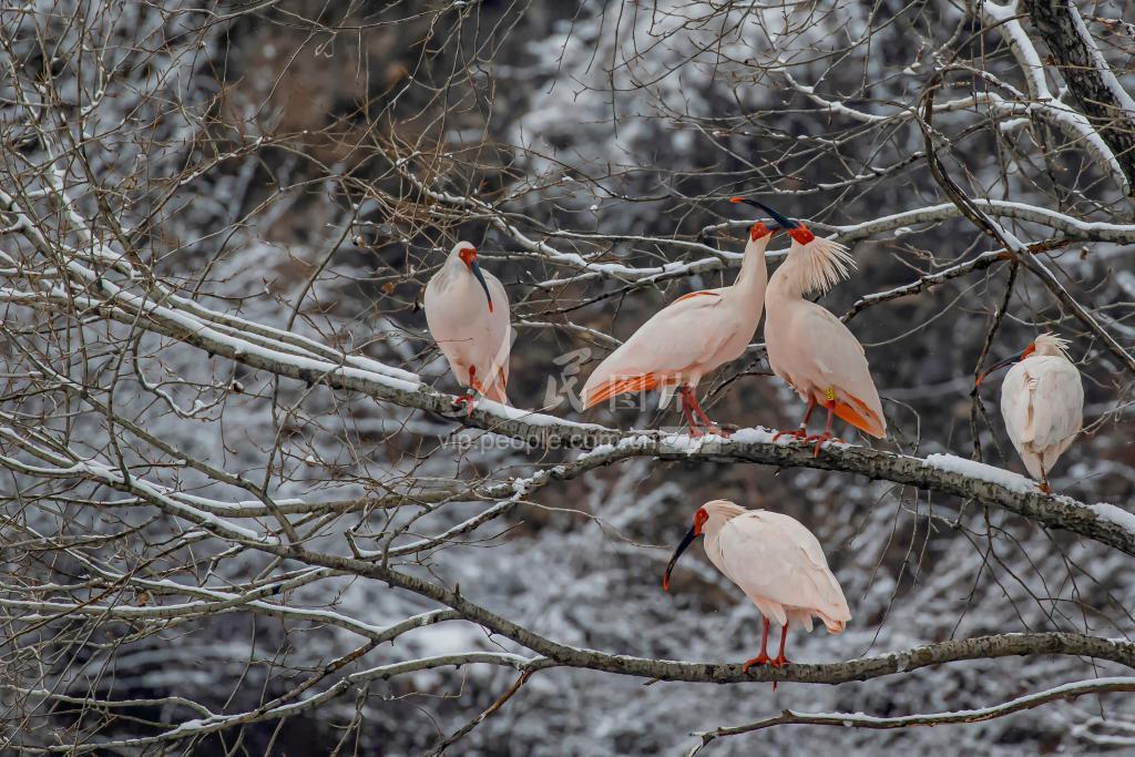 陕西耀州:秦岭以北野化放飞朱鹮雪中栖息