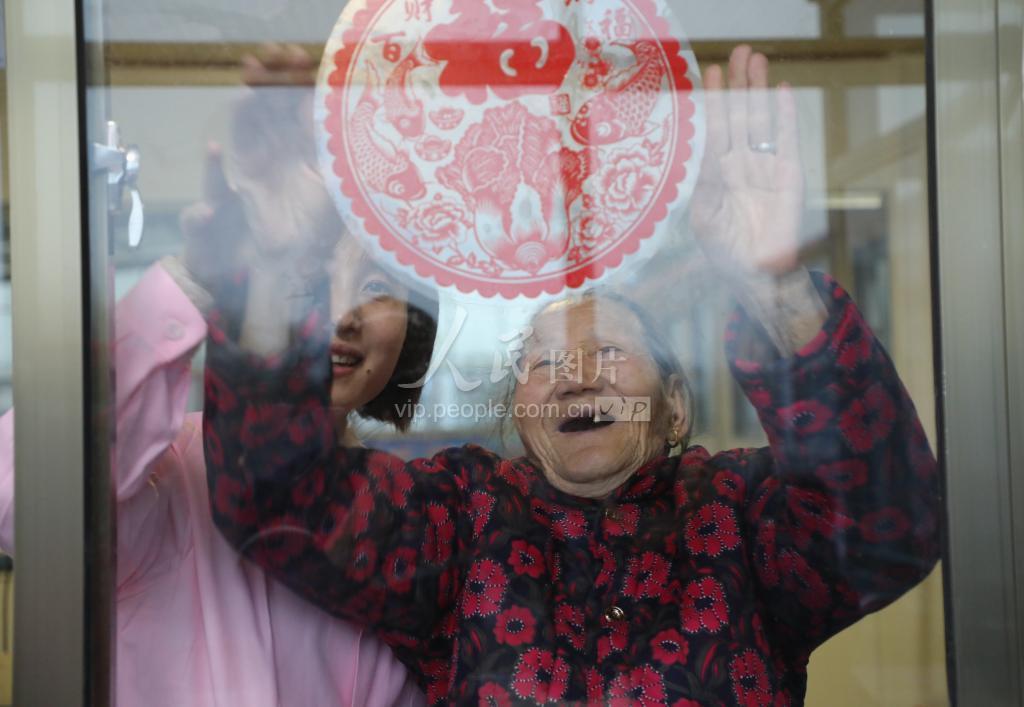 1月8日,95岁的沂蒙红嫂李树芹在“新家”贴窗花,老人乐得合不拢嘴。
