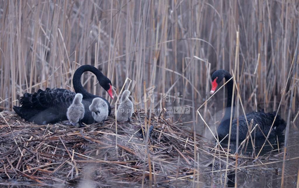 春节临近,山东省滕州市红荷湿地景区,一对黑天鹅夫妇喜添“新丁”,孵化出三只小天鹅,刚出壳的幼雏羽毛呈浅灰色,胎绒羽湿润,依偎在雌鸟翅下或腹下取暖,憨态可掬,甚是可爱,为即将到来的新春佳节增添了浓浓的喜庆气氛。