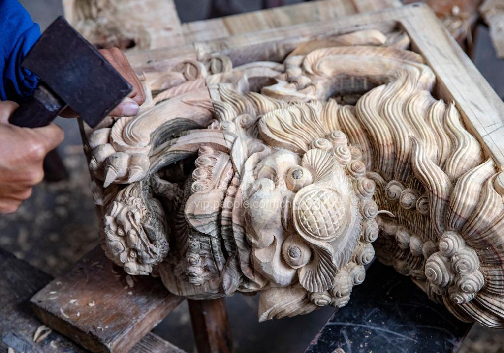 2019年12月25日,工人正在雕刻古戏台的配件。