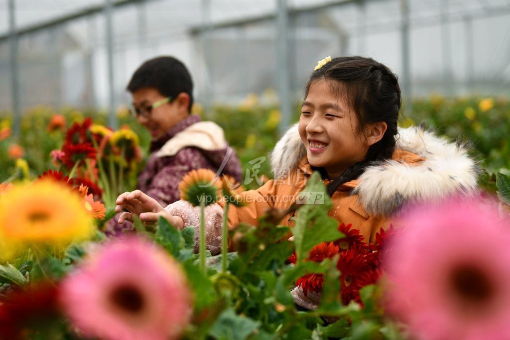 2020年1月12日,小朋友在湖北省通城县石南镇赛公村非洲菊基地赏花,采花。