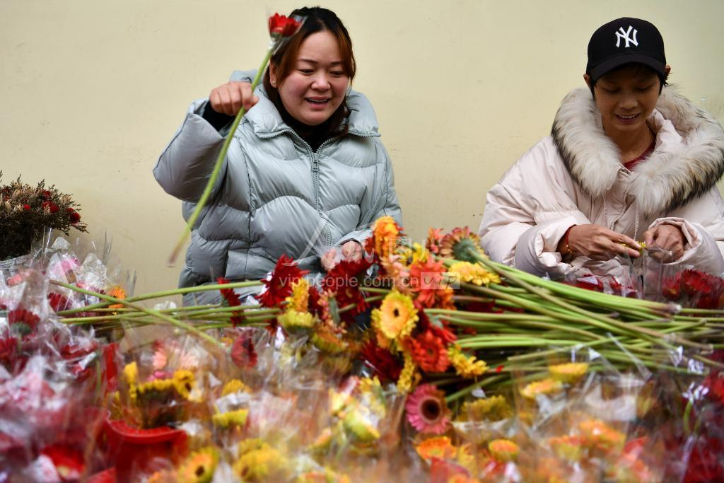 2020年1月12日,湖北省通城县石南镇赛公村非洲菊基地员工包装鲜花上市。