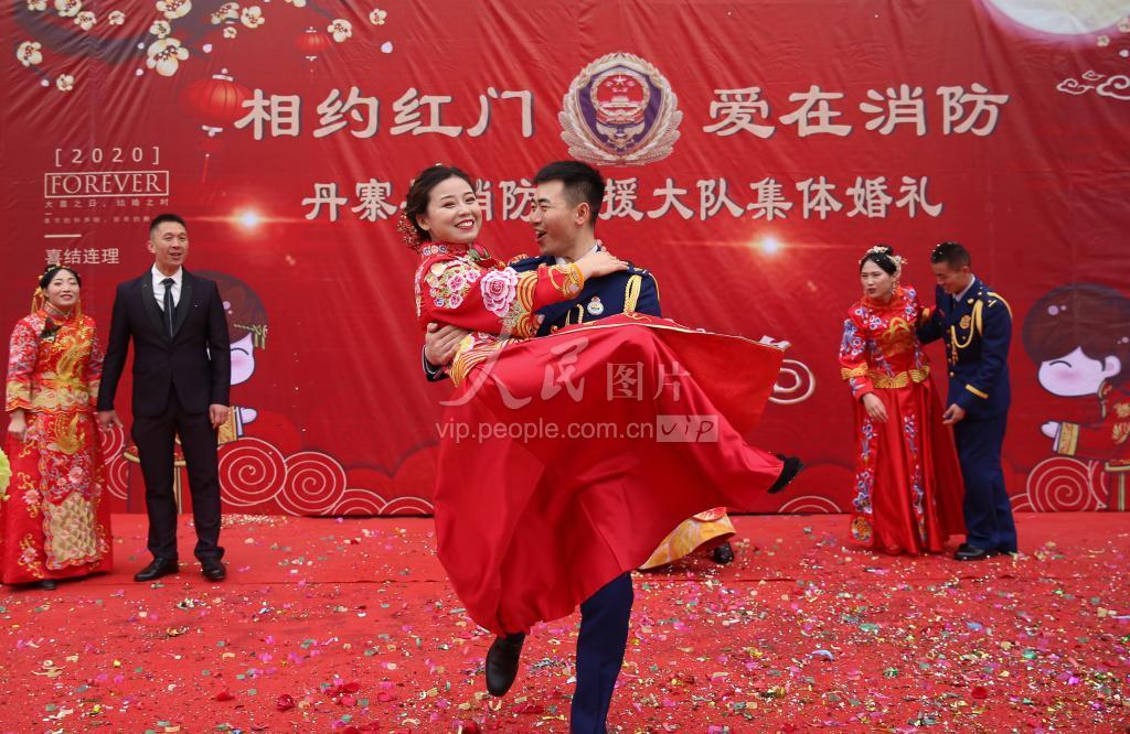 2020年1月14日,贵州省黔东南苗族侗族自治州丹寨县消防救援站营区举行“相约红门,爱在消防”为主题的别具特色集体婚礼,4对伉俪喜结良缘。婚礼上,新郎们以救援中常用的“黑暗行进救援”“抱式救人”等特殊方式与新娘们互动,让新娘们体验了一次消防救援工作的感受,大家在甜蜜而具有特殊意义的气氛中喜迎新春。