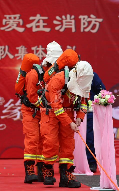 2020年1月14日,贵州省黔东南苗族侗族自治州丹寨县消防救援站营区举行“相约红门,爱在消防”为主题的别具特色集体婚礼,4对伉俪喜结良缘。婚礼上,新郎们以救援中常用的“黑暗行进救援”“抱式救人”等特殊方式与新娘们互动,让新娘们体验了一次消防救援工作的感受,大家在甜蜜而具有特殊意义的气氛中喜迎新春。