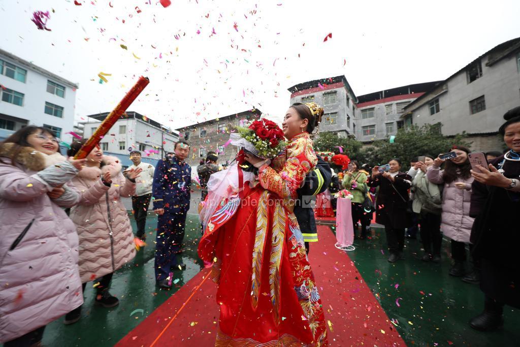 2020年1月14日,贵州省黔东南苗族侗族自治州丹寨县消防救援站营区举行“相约红门,爱在消防”为主题的别具特色集体婚礼,4对伉俪喜结良缘。婚礼上,新郎们以救援中常用的“黑暗行进救援”“抱式救人”等特殊方式与新娘们互动,让新娘们体验了一次消防救援工作的感受,大家在甜蜜而具有特殊意义的气氛中喜迎新春。