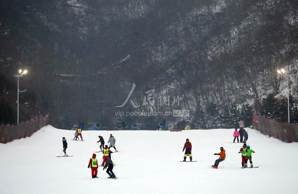 1月15日夜晚,滑雪爱好者在石家庄一家滑雪场的夜场中进行滑雪运动。