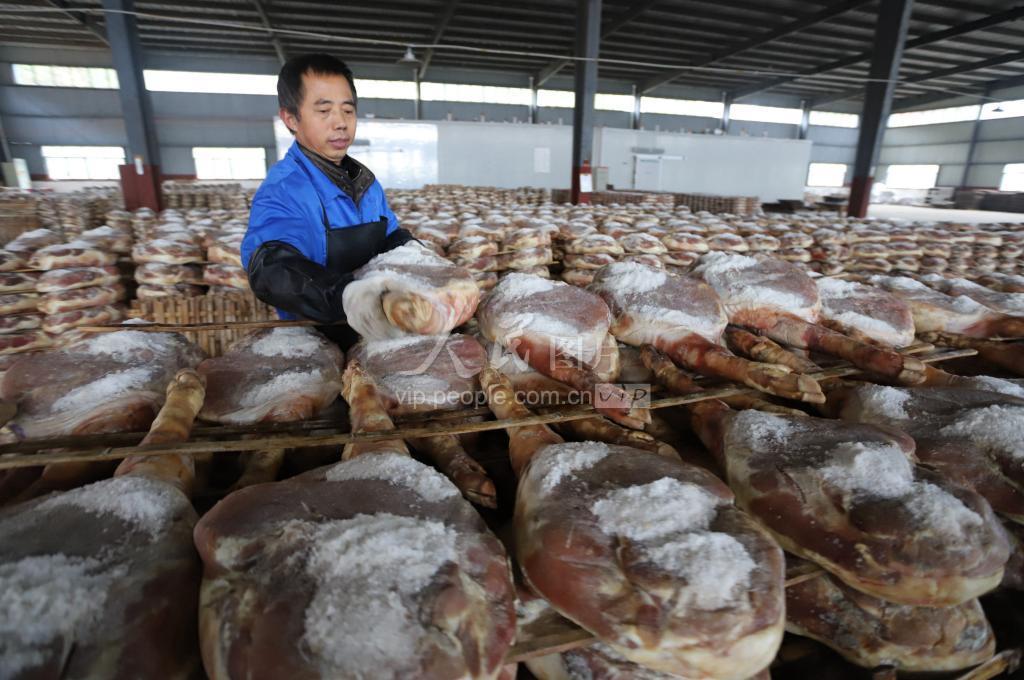2020年1月16日,江西省吉安市安福县枫田镇一家民营火腿公司员工在腌制火腿。安福火腿要经过修坯、上盐、腌制、洗腿、晒腿、整形、发酵、整形、堆码等10多道工序加工而成,其制作技艺已列入江西省级非物质文化遗产名录。春节前夕,是安福火腿腌制高峰期,安福县各火腿加工企业、专业户克服猪肉涨价不利因素,组织鲜腿收购,扩大订单渠道,加紧腌制火腿,稳定产量。