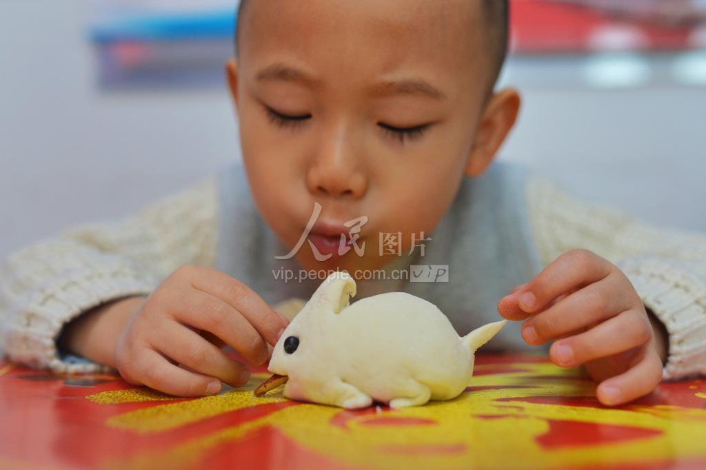 2020年1月16日,一名小朋友在青岛市市北萍乡路社区花样馒头比赛现场与小兔子面食嬉戏。