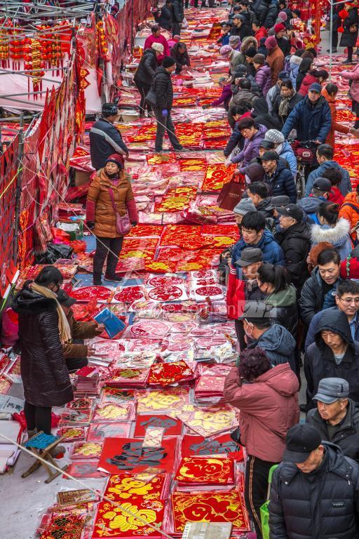 2020年1月16日,山东省青岛市李村大集,人们纷纷前来选购春联、置办年货,热闹的大集上红红火火年味浓浓。