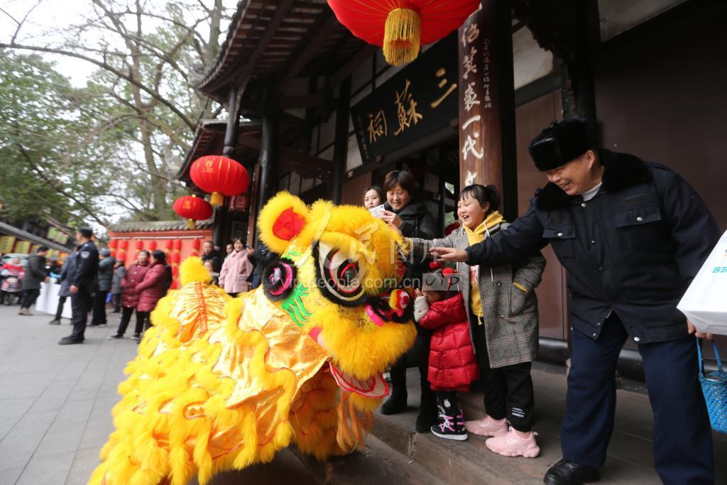 2020年1月19日,四川省眉山市三苏祠博物馆前,文艺工作者表演舞狮收到市民的欢迎。