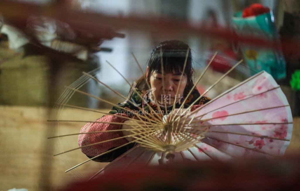 2020年1月19日,在四川泸州市江阳区分水岭镇,工人正在制作油纸伞。