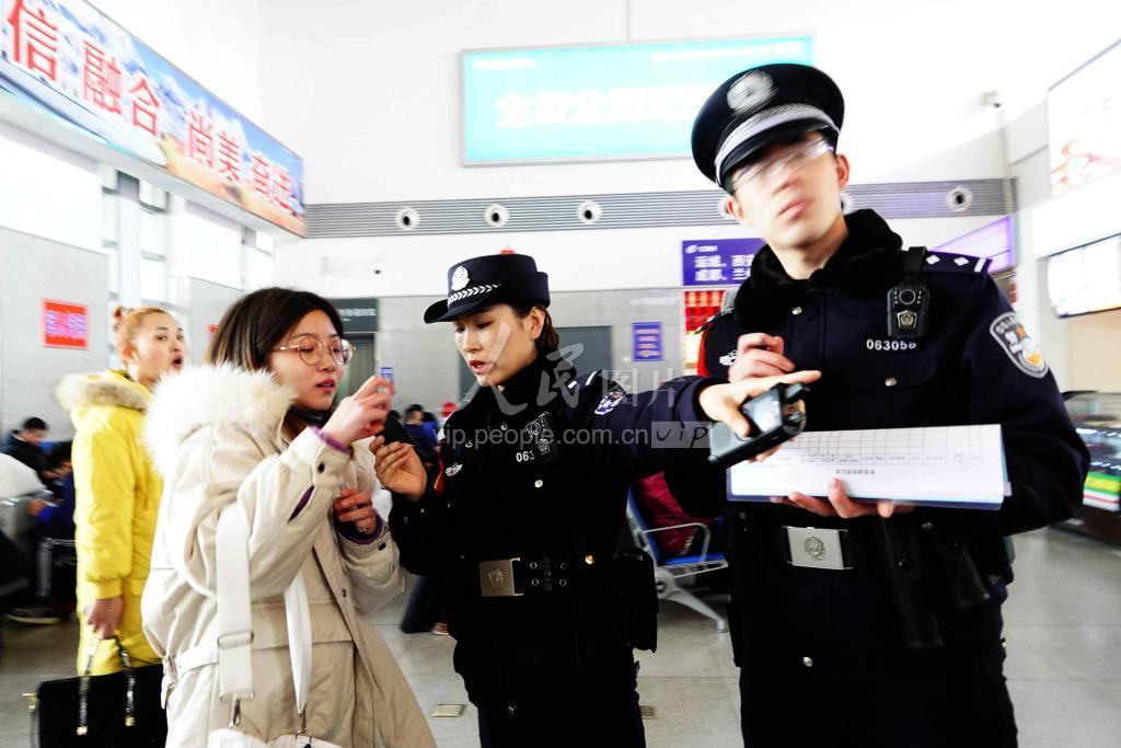1月20日,山西南部第二大铁路客运交通枢纽站临汾铁路公安处侯马车站派出所侯马西站(高铁站)警务区值勤民警(左三)在候车室为旅客指引乘车入口。