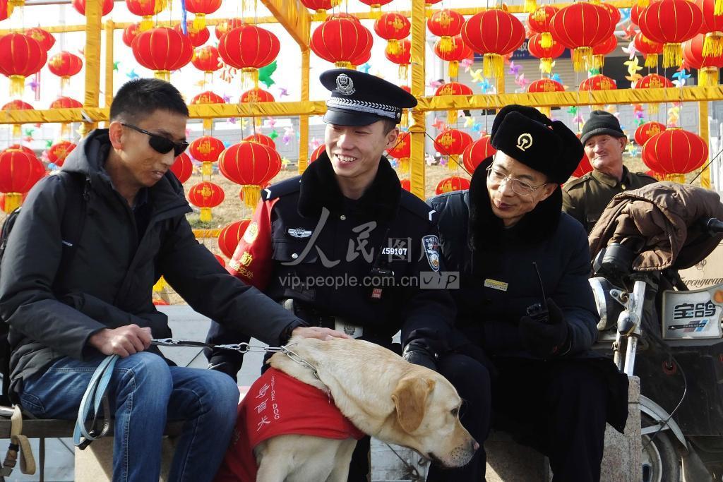 1月20日,在山西南部第二大铁路客运交通枢纽站临汾铁路公安处侯马车站派出所侯马西站(高铁站)警务区,值勤民警(左二)和客运人员在陪伴盲人旅客聊天等待家属前来接站。