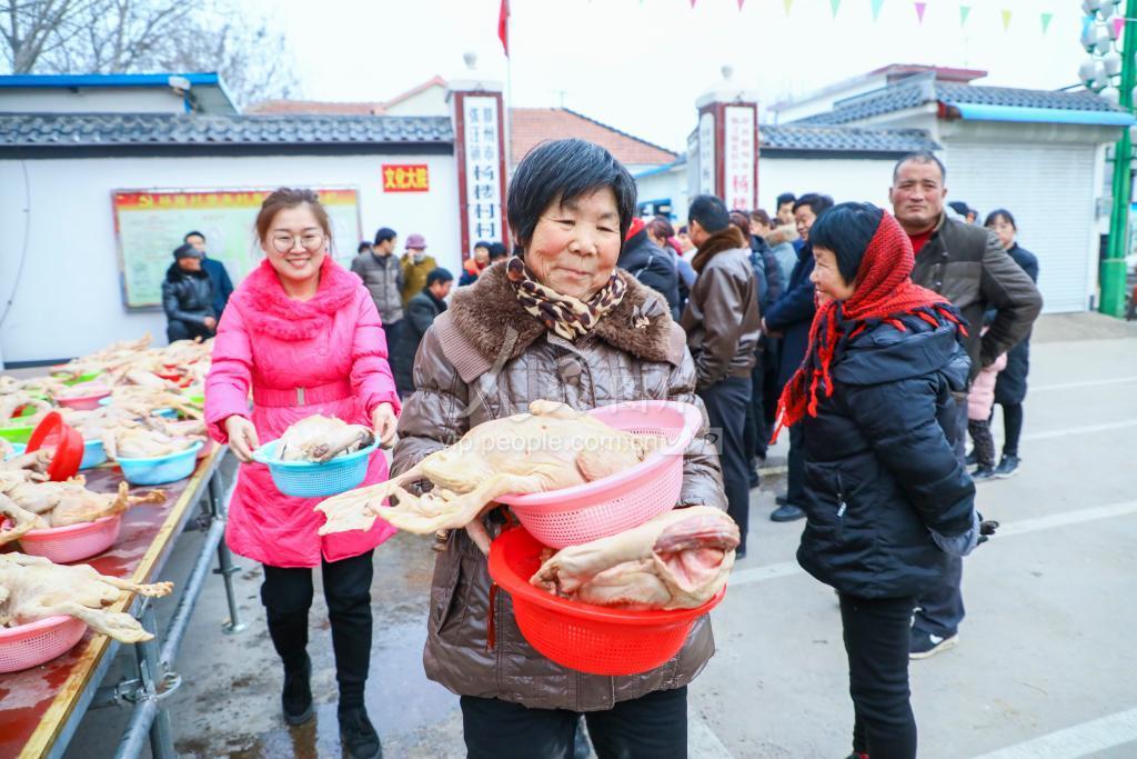 2020年1月21日,山东省滕州市张汪镇杨楼村民正在领分红的大肥鸭。滕州市张汪镇杨楼村自2013年将村里540亩土地整建制流转后,成立杨楼股份、马铃薯专业、劳务输出三个合作社。村民不出村就在家门口打工就业,目前,杨楼村民人均收入达到15200元。三个合作社成立后,每年在春节前,杨楼村委会都为全村112户村民送年货、送春联、送文化,让党的好政策惠及每一户村民,让村民享受到发展集体经济带来的红利。