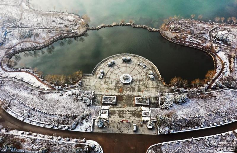 上传时间: 2020-01-28 09:07:34 图片说明: 1月27日,山东省枣庄市山亭区紫云湖公园雪后美景(无人机拍摄)。