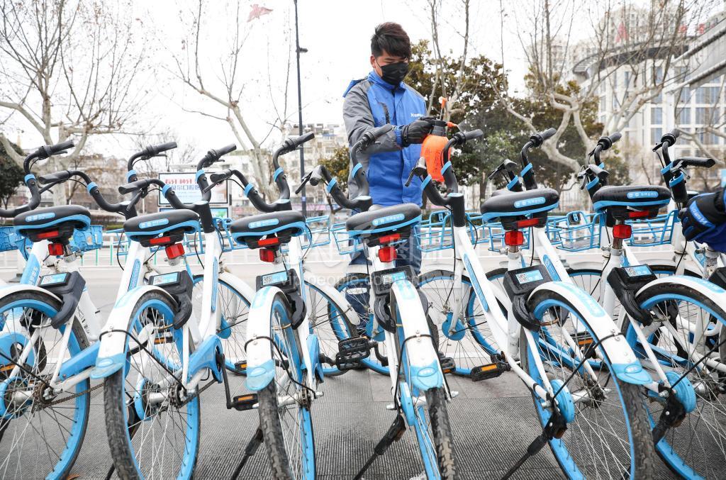 江苏淮安:齐心战“疫” 街头共享单车全面消毒