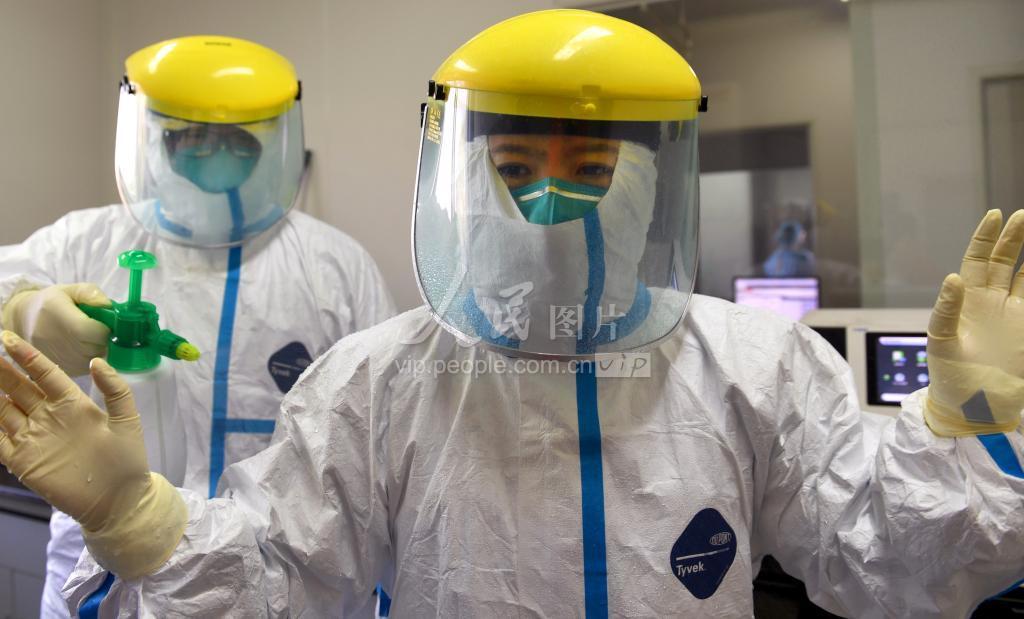 2月4日,两名实验室检测人员完成新型冠状病毒核酸检测工作后,进行防护服外消毒,确保实验室生物安全。