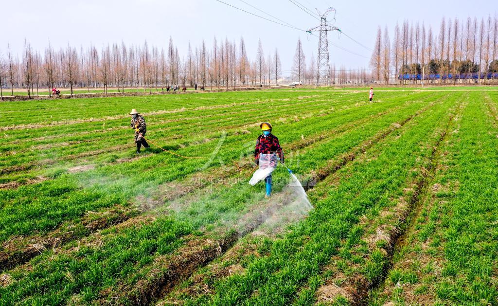 2020年2月5日,安徽省合肥市庐江县郭河镇广寒村田素萍家庭农场的农田里,农民们正在抢抓农时给小麦施肥、除草。 随着春耕序幕拉开,庐江县田间地头一片忙碌。农民们一手抓疫情防控、一手抓春耕生产,趁着天气回暖的有利时机,对小麦进行施肥、除草等管护工作,确保小麦油菜等农作物稳产增收。